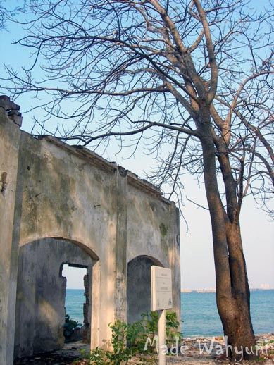 Salah satu pulau yang saya kategorikan ‘Pulau Menyeramkan’ adalah Pulau Cipir atau Pulau Kahyangan. Pertamakali menginjakkan kaki di pulau ini aura menakutkan langsung menyergap. Bagaimana tidak, seisi pulau ini dipenuhi reruntuhan bangunan dan pohon-pohon yang meranggas, yang menurut teman saya Dhede Wantah, pohon yang “tidak biasa”. Ada beberapa bangunan tua yang masih utuh, namun lebih banyak lagi yang hanya tinggal reruntuhan temboknya saja. Pulau Cipir relatif sepi dari pengunjung. Angin pantai yang sepoi-sepoi membuat ranting pepohonan berdesir sehingga menambah suasana semakin menakutkan saja. Satu-satunya bangunan yang tidak menakutkan dan menurut saya cenderung aneh, hanya Tugu Prasasti Pulau Cipir yang dibuat oleh Dinas Museum dan Sejarah Pemerintah DKI Jakarta.