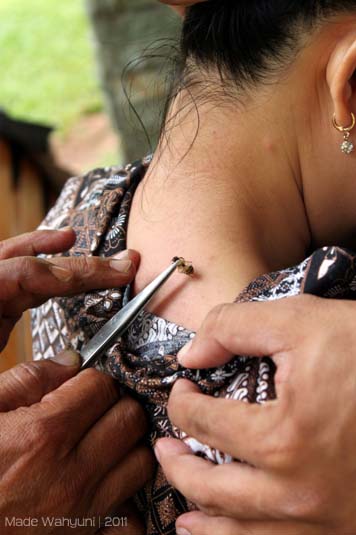Boleh dibilang, inilah kali pertama saya mendengar dan melihat secara langsung pengobatan Terapi Sengat Lebah. Saya dan sahabat saya, Nevy Elysa, terkesima menyaksikan Bapak Mudakir sang terapis menyengatkan lebah ke tubuh pasiennya. Lebih terkesima lagi sewaktu mendengar jerit kesakitan dari seorang pasien cewek yang sedang menjalani pengobatan. Agak mengerikan, sih.