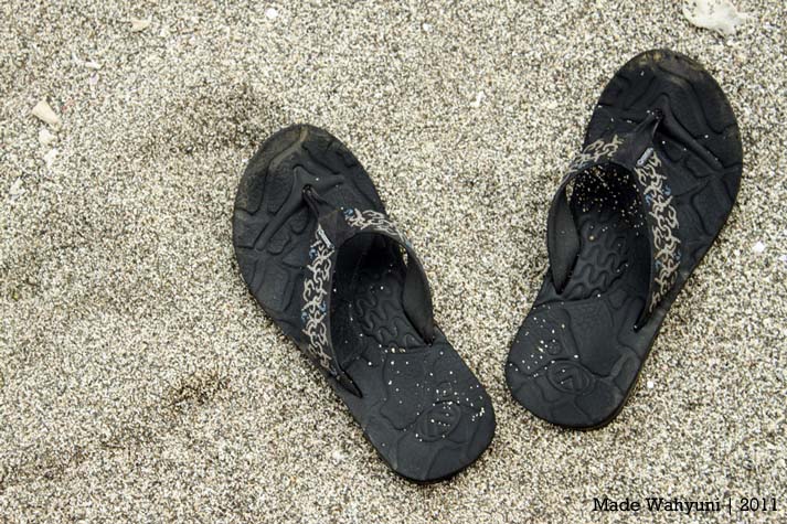 Kali ini saya mau bercerita tentang sendal gunung kesayangan saya. Terus terang saya belum pernah memakai sendal gunung merk lain selain Eiger. Model yang saya pilih pun selalu sama, yang model sendal jepit. Sendal gunung Eiger saya terbukti handal dipakai di segala medan. Dipakai ke Gunung Krakatau yang jalurnya berpasir oke, diajak becek-becekan nyari air terjun oke, bahkan di trek berlumpur ala Pulau Sempu, sendal Eiger masih oke dan tidak putus. Dipakai ke pantai juga cocok. Saya juga sering kok pakai sendal Eiger kesayangan saya ini ke Mal. Pernah juga saya pakai sembahyang ke Pura bersanding dengan kebaya dan kain gara-gara males nyari sendal lain.