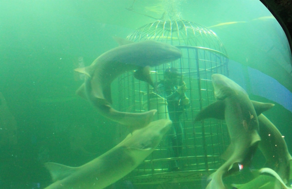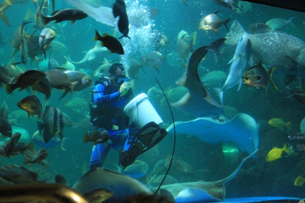 Menurut saya kalau ke Sea World emang paling enak pas jamnya ngasi makan. Seru aja sih. Apalagi di SharkQuarium. Jadi waktu paling pas buat ke Sea World itu jam 12 siang sampe jam 4 sore. Jangan sampe kelewat ya acara ngasi makan di SharkQuarium, karena paling kerenn. Penyelamnya dikerangkeng turun pelan-pelan dan langsung dikerubutin sama ikan Hiu Buto dan teman-temannya. Diakhir acara, semua ikannya disebar dan hiu-hiu langsung berpesta pora ngejar ikan. Eh, Kalau kamu penasaran pengen megang hiu, di akuarium sentuh ada anak ikan hiu yang boleh dipegang-pegang. Lucu deh 🙂