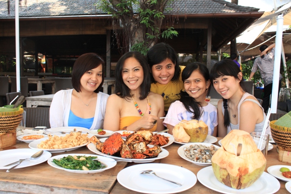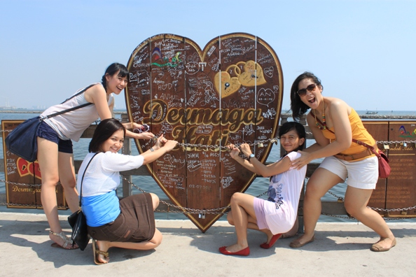 Nah, pas jalan-jalan ini kita nemuin Dermaga Hati. Disini banyak gembok-gembok yang ada tulisan nama pasangan bergantung di rantai besi. Konon katanya, jika sepasang kekasih masang gembok yang bertuliskan nama mereka disini maka hubungan mereka akan abadi. Ritualnya, Setelah gemboknya dikunci, kunci gemboknya dibuang ke laut jadi supaya engga ada yang nemuin dan buka gemboknya lagi. Jadi penasaran, ada gak yang pernah masang gembok disini? 🙂Puas foto-foto di Dermaga Hati dan jembatan, kami lanjut makan siang di Bandar Jakarta. Kepiting dan kawan-kawannya menjadi korban keganasan 5 cewek yang kelaparan. Enyakk…